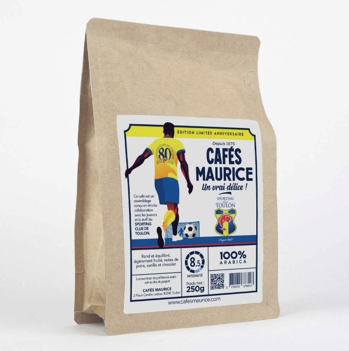 Pour honorer cet anniversaire, Cafés Maurice crée un café en édition limitée, imaginé aux couleurs et aux valeurs du Sporting Club de Toulon. Cette cuvée exclusive, torréfiée avec le plus grand soin, incarne le caractère et la passion qui animent le club et ses supporters depuis 1945.
